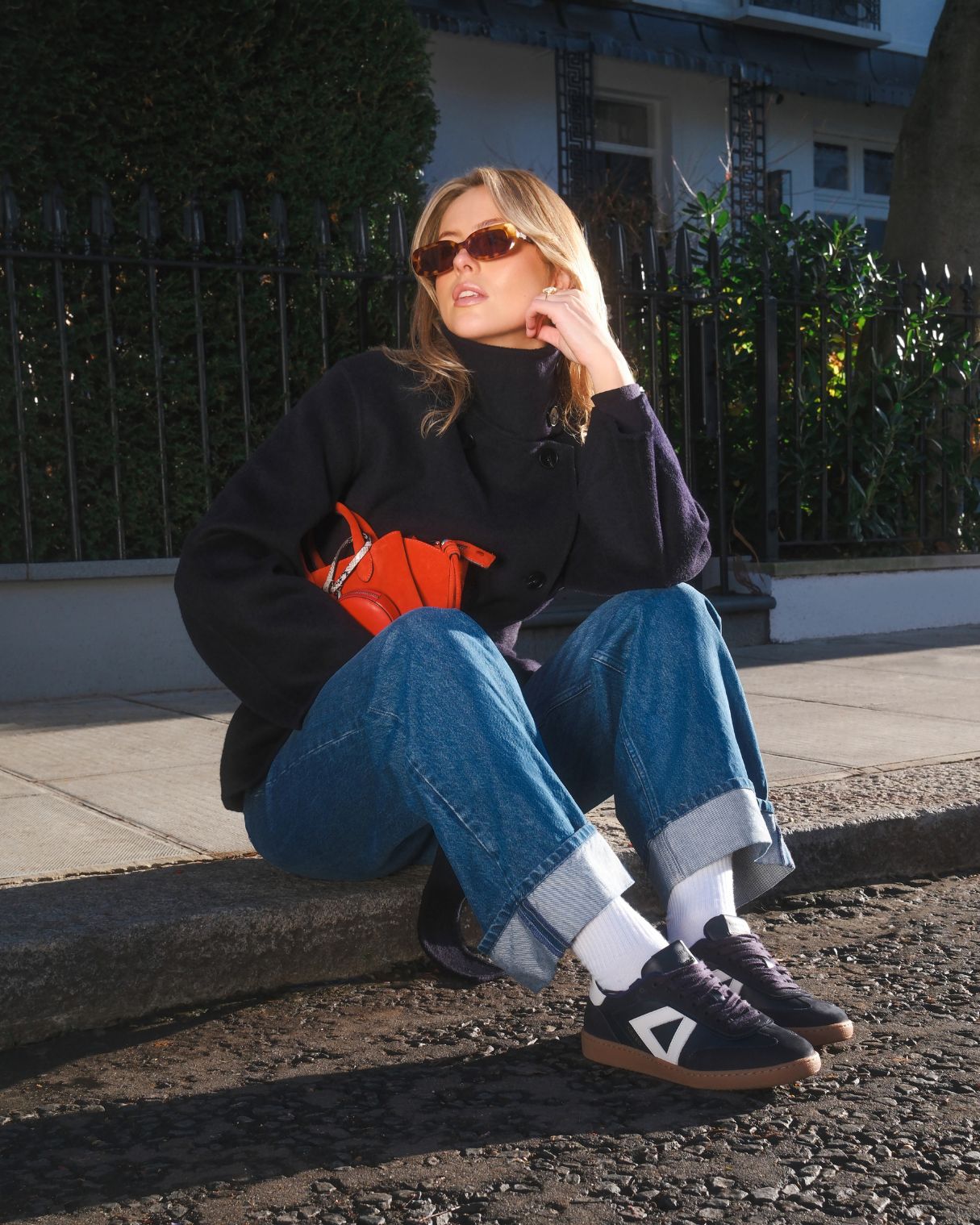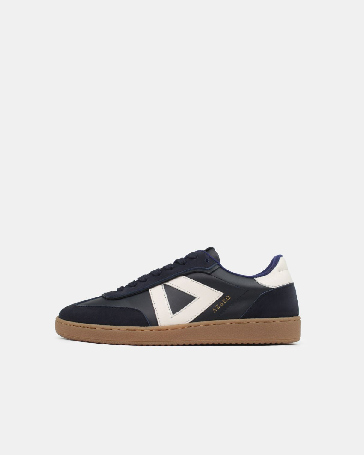 The Hera Midnight Blue & Stone is a retro-inspired, low-top trainer with a sleek navy blue leather upper, stone leather contrast panelling and gum rubber outsoles.
