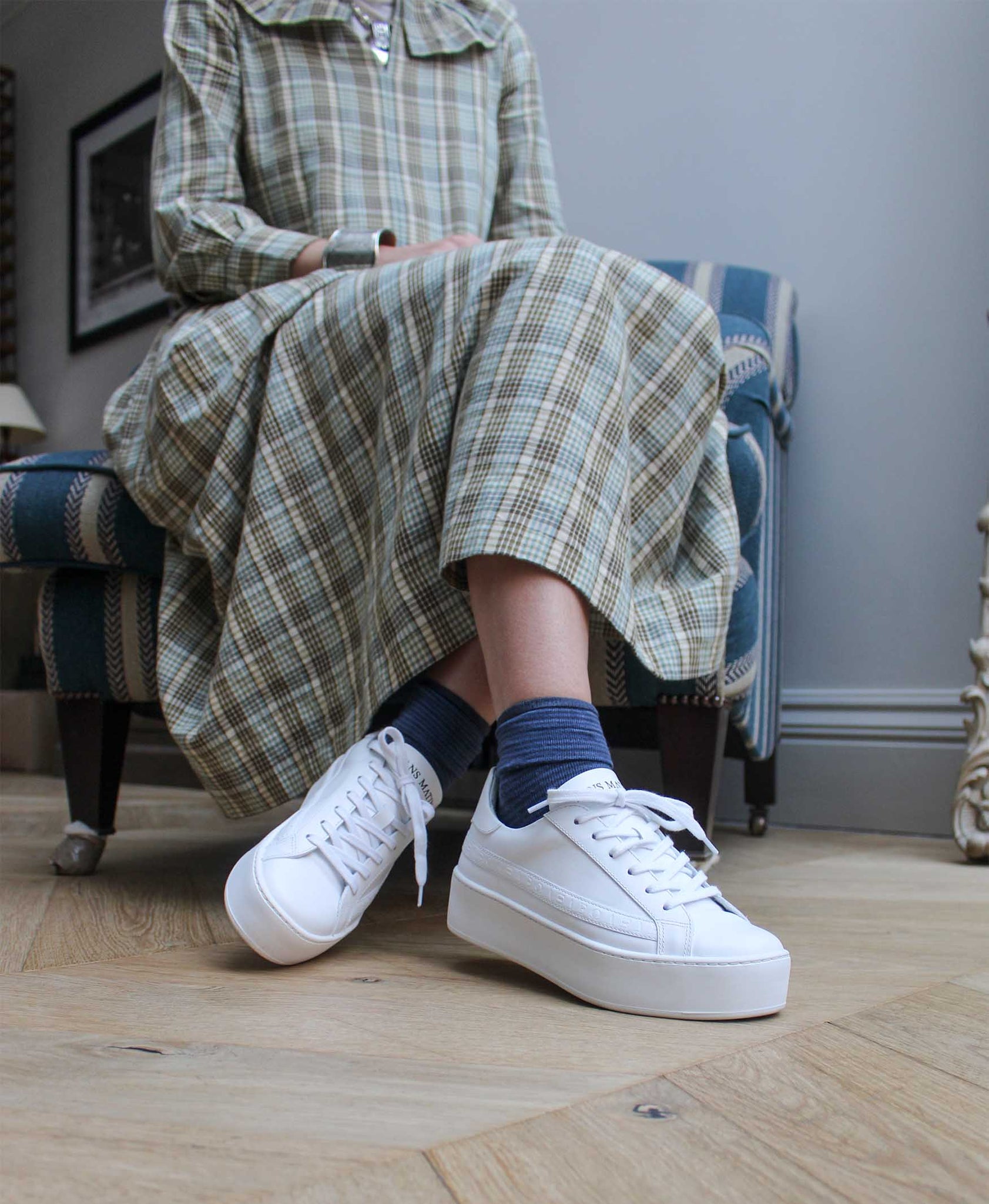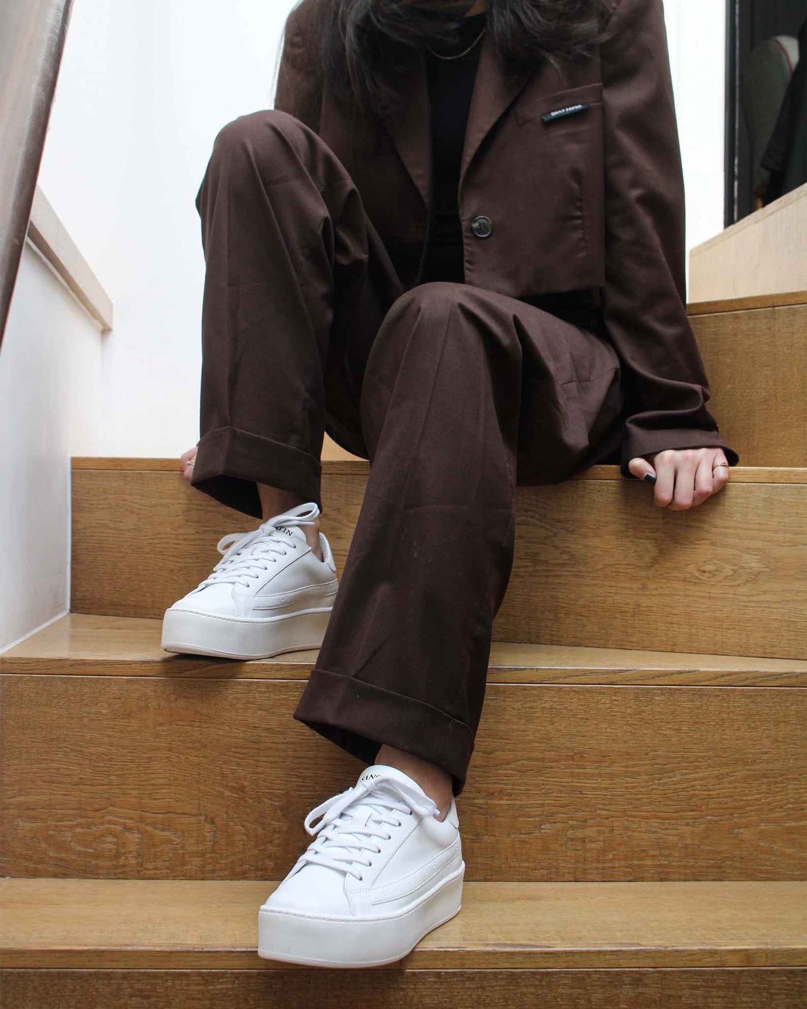 Previously named the Lala, discover the perfect blend of comfort and timeless style with our Gaia platform trainers. Designed in London and ethically handcrafted in Europe, these shoes feature a luxurious soft white leather upper and our signature embossed leather side strip, a platformed white rubber outsole and white Tencel laces.